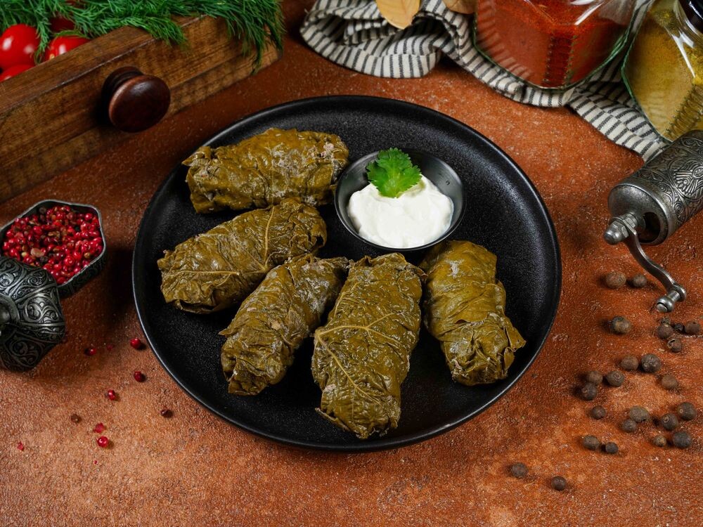 Говядина, рис, лук, виноградный лист, специи