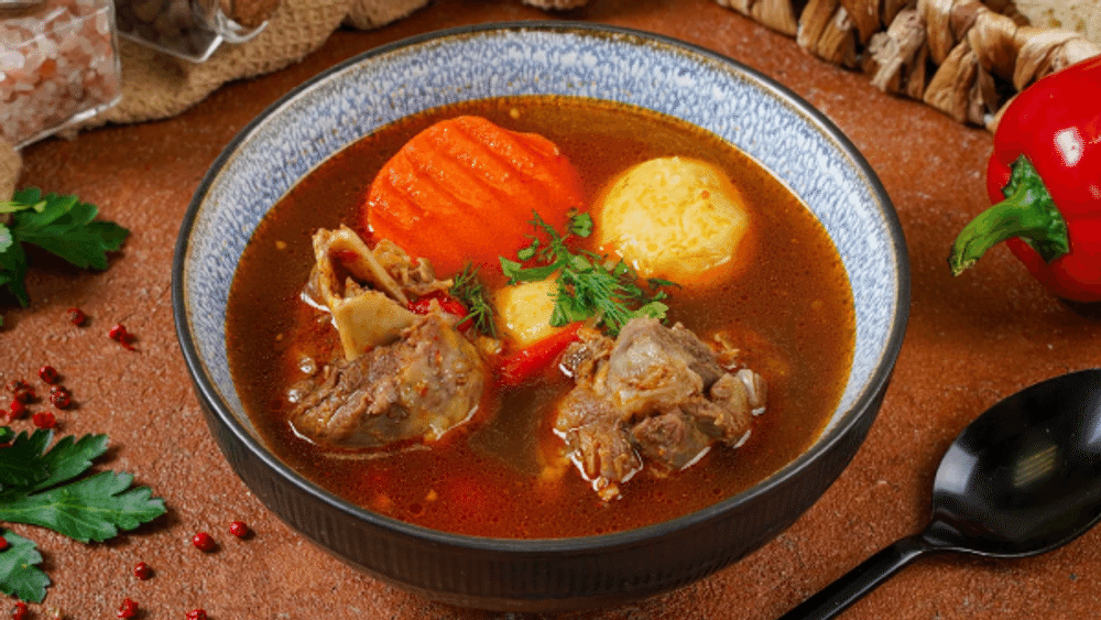 картофель, морковь, нут, перец болгарский, лук, говяжий бульон, специи, баранина
