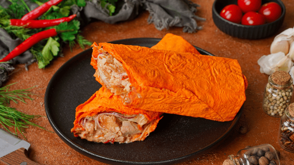 куриное филе, пекинская капуста, красный лук, томаты, маринованные огурцы, соус чесночный, соус томатный