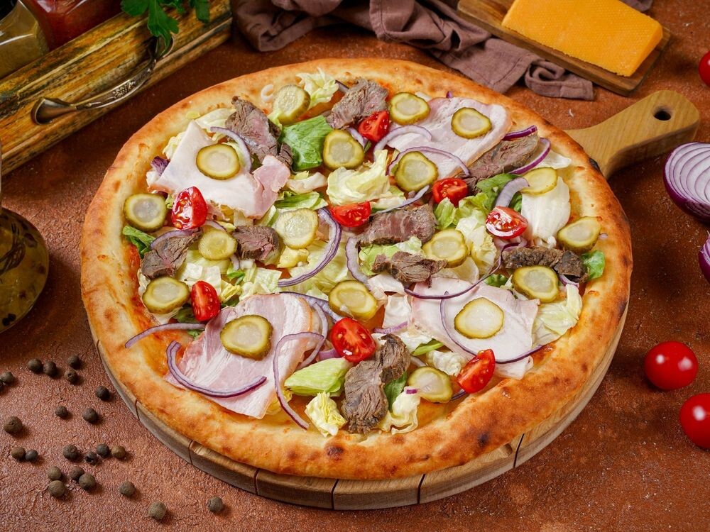 говядина, бекон, салат айсберг, красный лук, томаты, корнишоны, сыр моцарелла, соус бургер, тесто