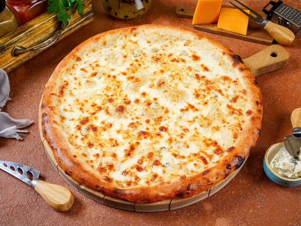 сыр моцарелла, чеддер, пармезан, дорблю, сливочный соус, тесто