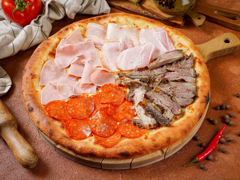 пеперони, ветчина из индейки, бекон, говядина, пицца-соус, сыр моцарелла, тесто