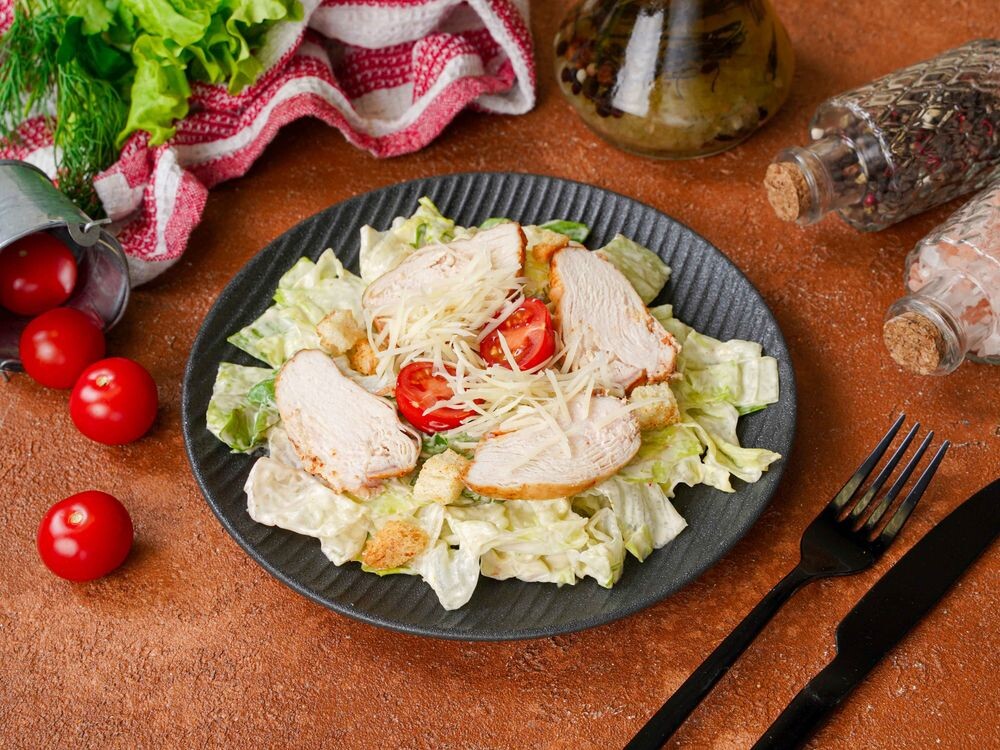 Куриное филе, салат айсберг, помидоры черри, сыр пармезан, гренки, соус цезарь