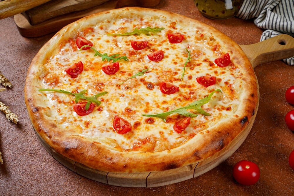 Сыр моцарелла, руккола, помидоры черри, пицца соус