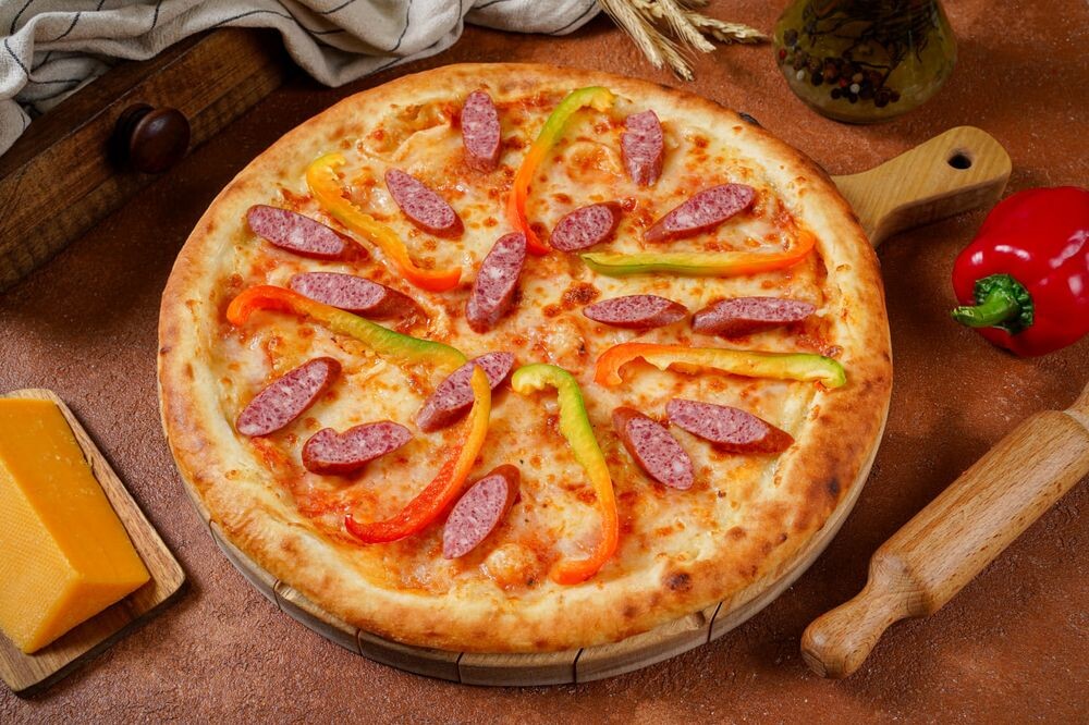 Колбаски охотничьи, перец болгарский, сыр моцарелла, пицца соус