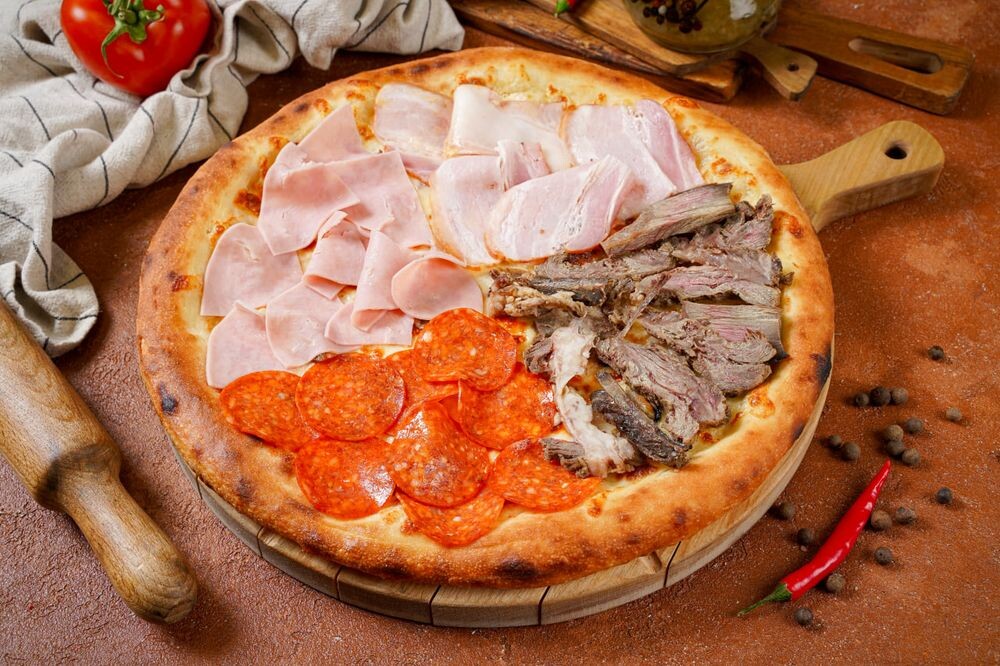 Пепперони, ветчина, бекон, говядина, пицца соус, сыр моцарелла